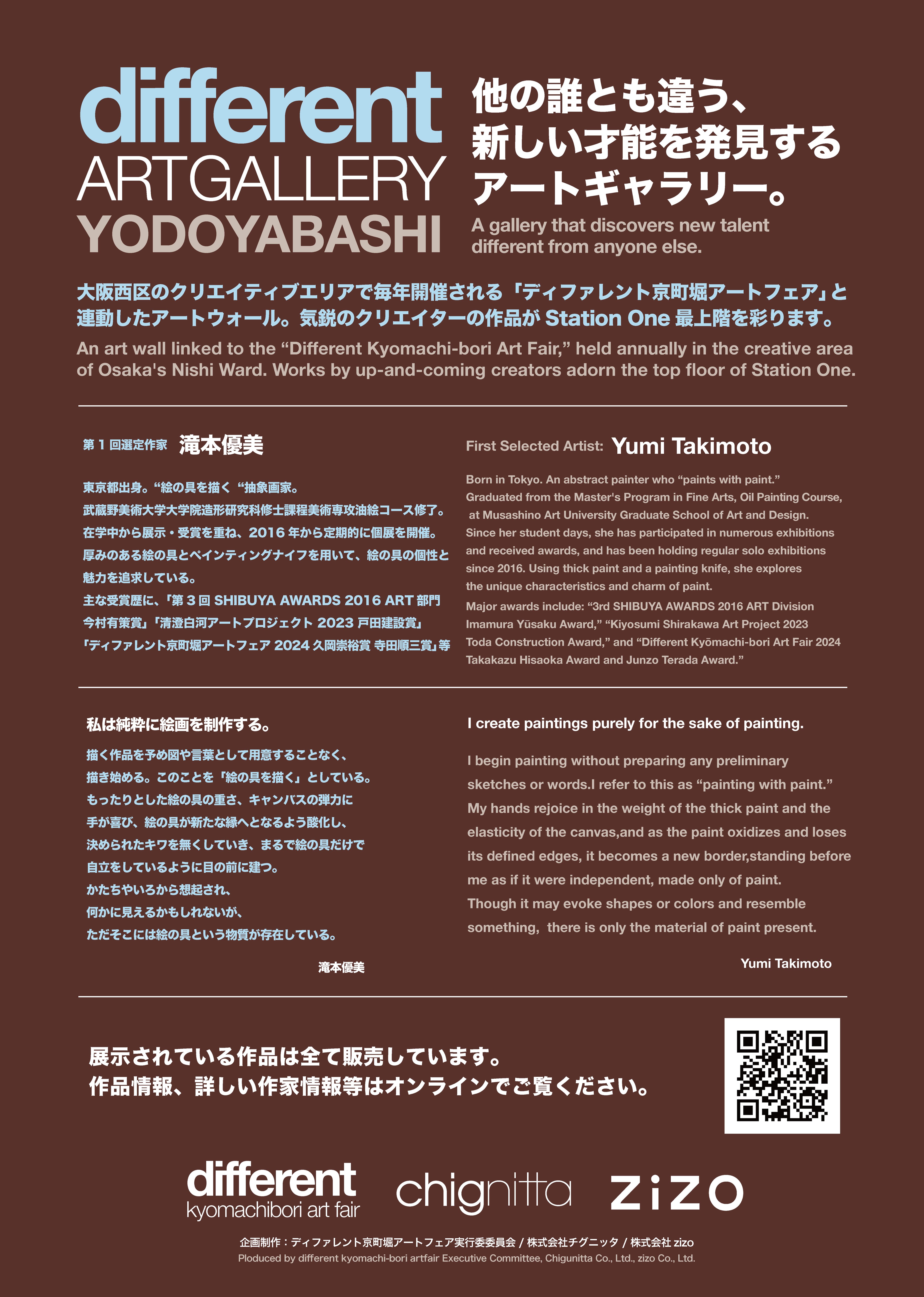 大阪の新しいランドマーク「淀屋橋ステーションワン」最上階にある「different ART GALLERY YODOYABASHI」で現在個展開催中。現代美術家、滝本優美の作品をオンライン販売します。