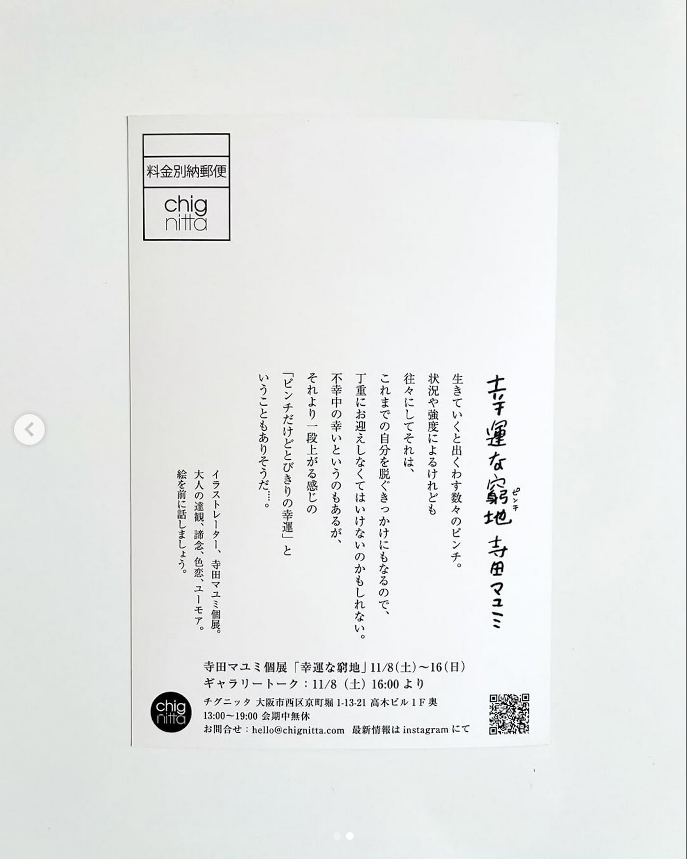 京町堀チグニッタで開催中、寺田マユミ個展「幸運な窮地(ピンチ)」展示作品をオンラインでも販売します。大人の達観、諦念、色恋、ユーモア溢れる独自の物語をお楽しみください。海外発送も承ります。