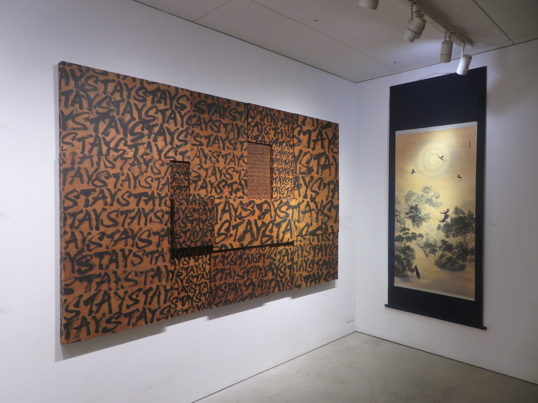 雨墨、シルクスクリーン、アクリルスプレー、木製パネルに和紙