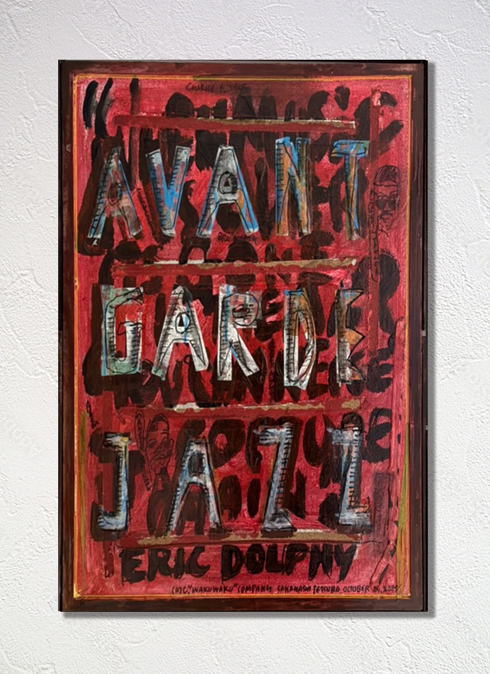 Sakanashi Tetsuro has run a small jazz bar in Osaka's Tenmabashi for 47 years. Using paper plates as his palette and paint as his medium, he creates works in the bar's space, transforming it into his studio after closing hours. His paintings, rendered on corkboard panels, feature portraits of jazz musicians, scenes with jazz records, and showcase his exceptional typographic sensibility. We also ship internationally.