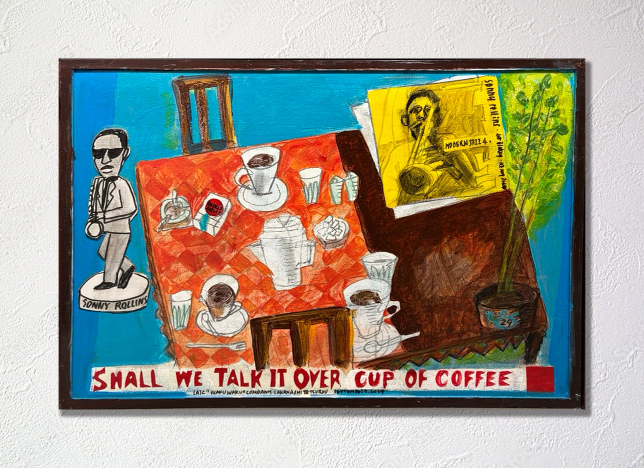 Sakanashi Tetsuro has run a small jazz bar in Osaka's Tenmabashi for 47 years. Using paper plates as his palette and paint as his medium, he creates works in the bar's space, transforming it into his studio after closing hours. His paintings, rendered on corkboard panels, feature portraits of jazz musicians, scenes with jazz records, and showcase his exceptional typographic sensibility. We also ship internationally.
