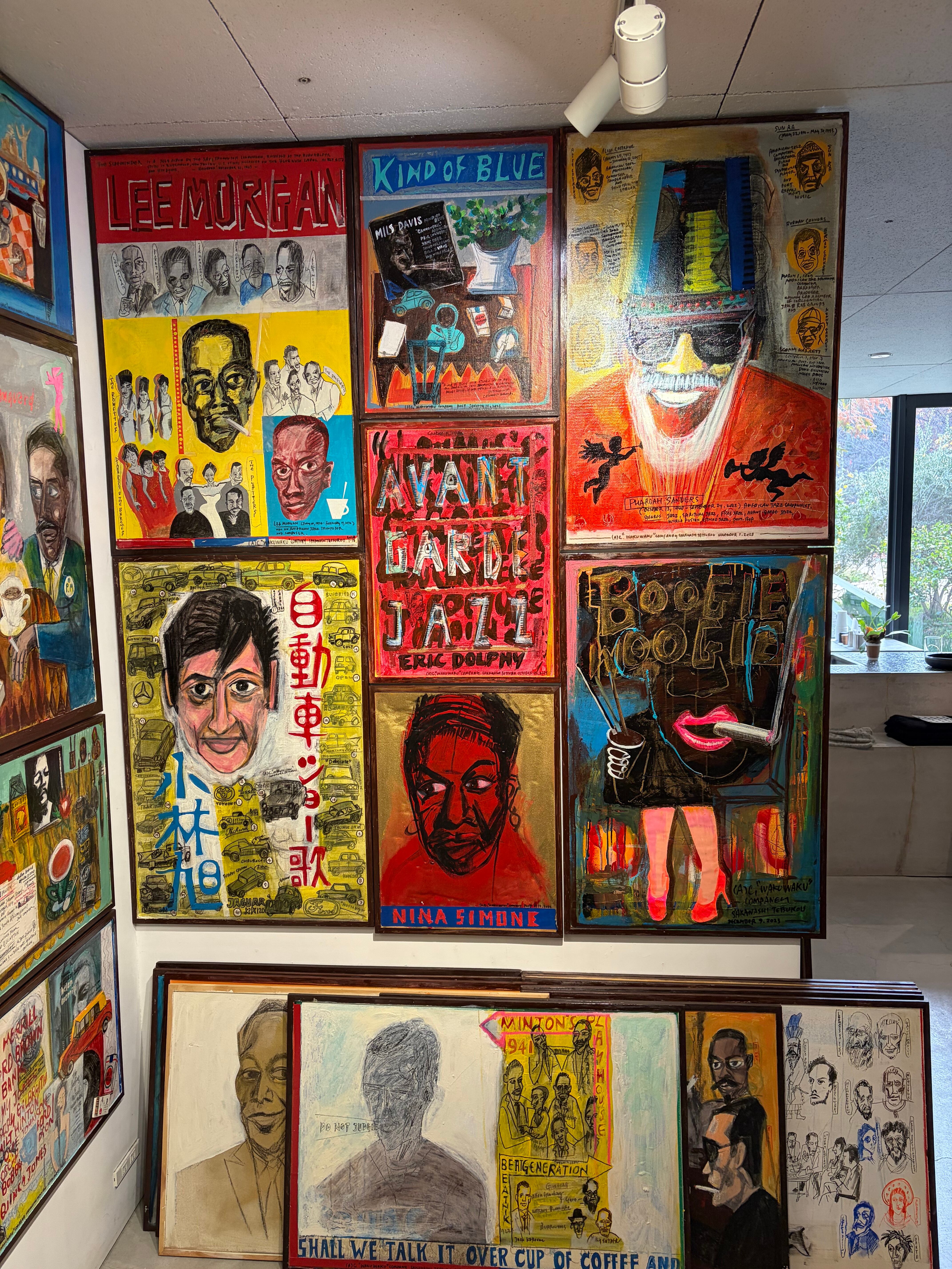 Sakanashi Tetsuro has run a small jazz bar in Osaka's Tenmabashi for 47 years. Using paper plates as his palette and paint as his medium, he creates works in the bar's space, transforming it into his studio after closing hours. His paintings, rendered on corkboard panels, feature portraits of jazz musicians, scenes with jazz records, and showcase his exceptional typographic sensibility. We also ship internationally.