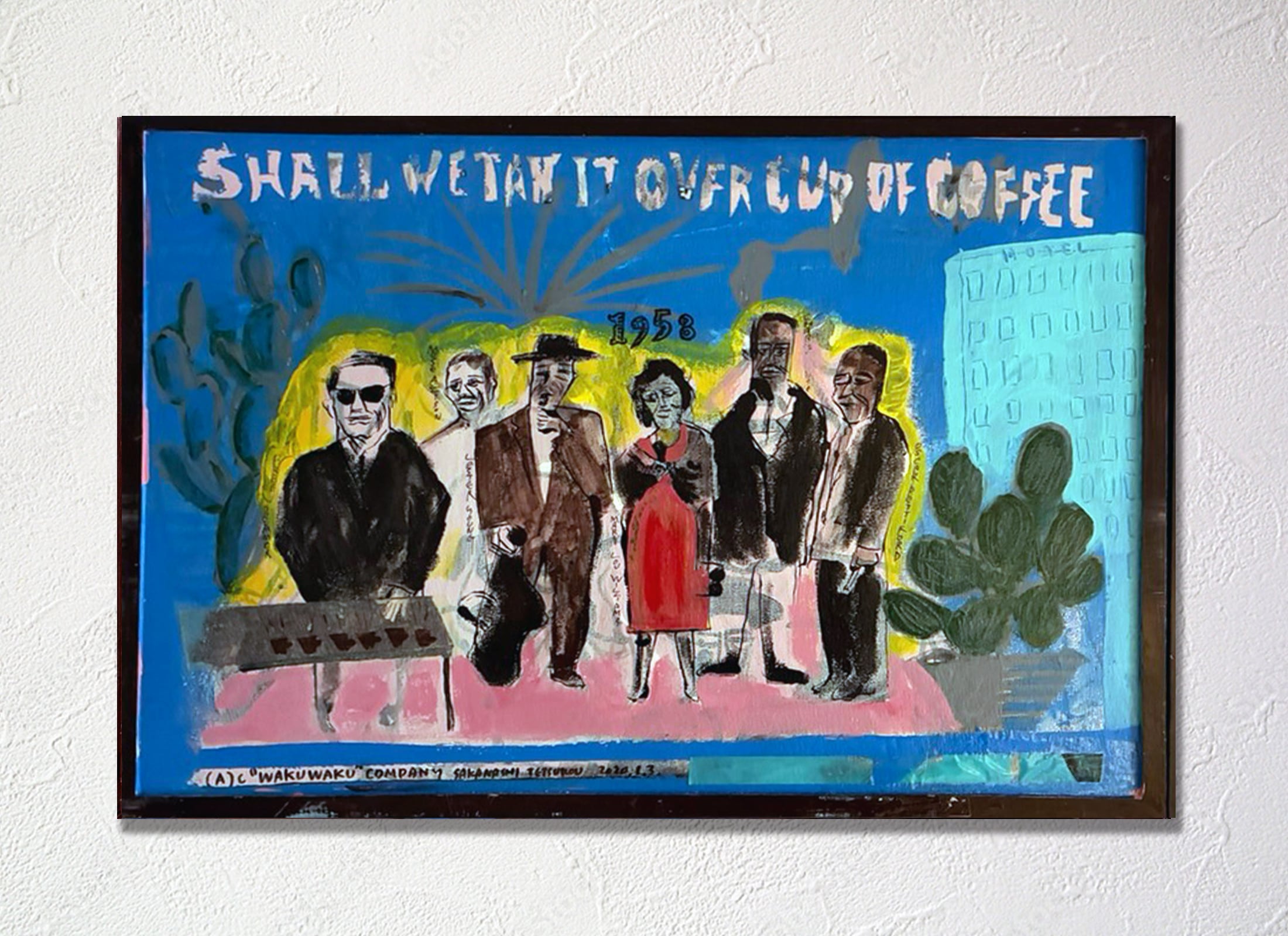 Sakanashi Tetsuro has run a small jazz bar in Osaka's Tenmabashi for 47 years. Using paper plates as his palette and paint as his medium, he creates works in the bar's space, transforming it into his studio after closing hours. His paintings, rendered on corkboard panels, feature portraits of jazz musicians, scenes with jazz records, and showcase his exceptional typographic sensibility. We also ship internationally.