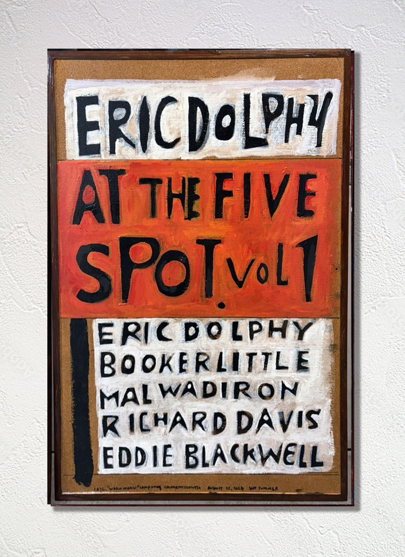 Sakanashi Tetsuro has run a small jazz bar in Osaka's Tenmabashi for 47 years. Using paper plates as his palette and paint as his medium, he creates works in the bar's space, transforming it into his studio after closing hours. His paintings, rendered on corkboard panels, feature portraits of jazz musicians, scenes with jazz records, and showcase his exceptional typographic sensibility. We also ship internationally.