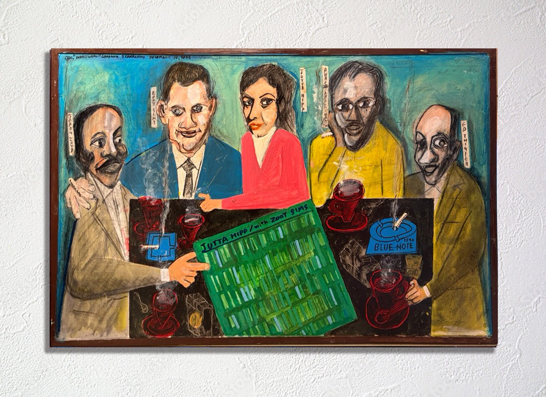 Sakanashi Tetsuro has run a small jazz bar in Osaka's Tenmabashi for 47 years. Using paper plates as his palette and paint as his medium, he creates works in the bar's space, transforming it into his studio after closing hours. His paintings, rendered on corkboard panels, feature portraits of jazz musicians, scenes with jazz records, and showcase his exceptional typographic sensibility. We also ship internationally.