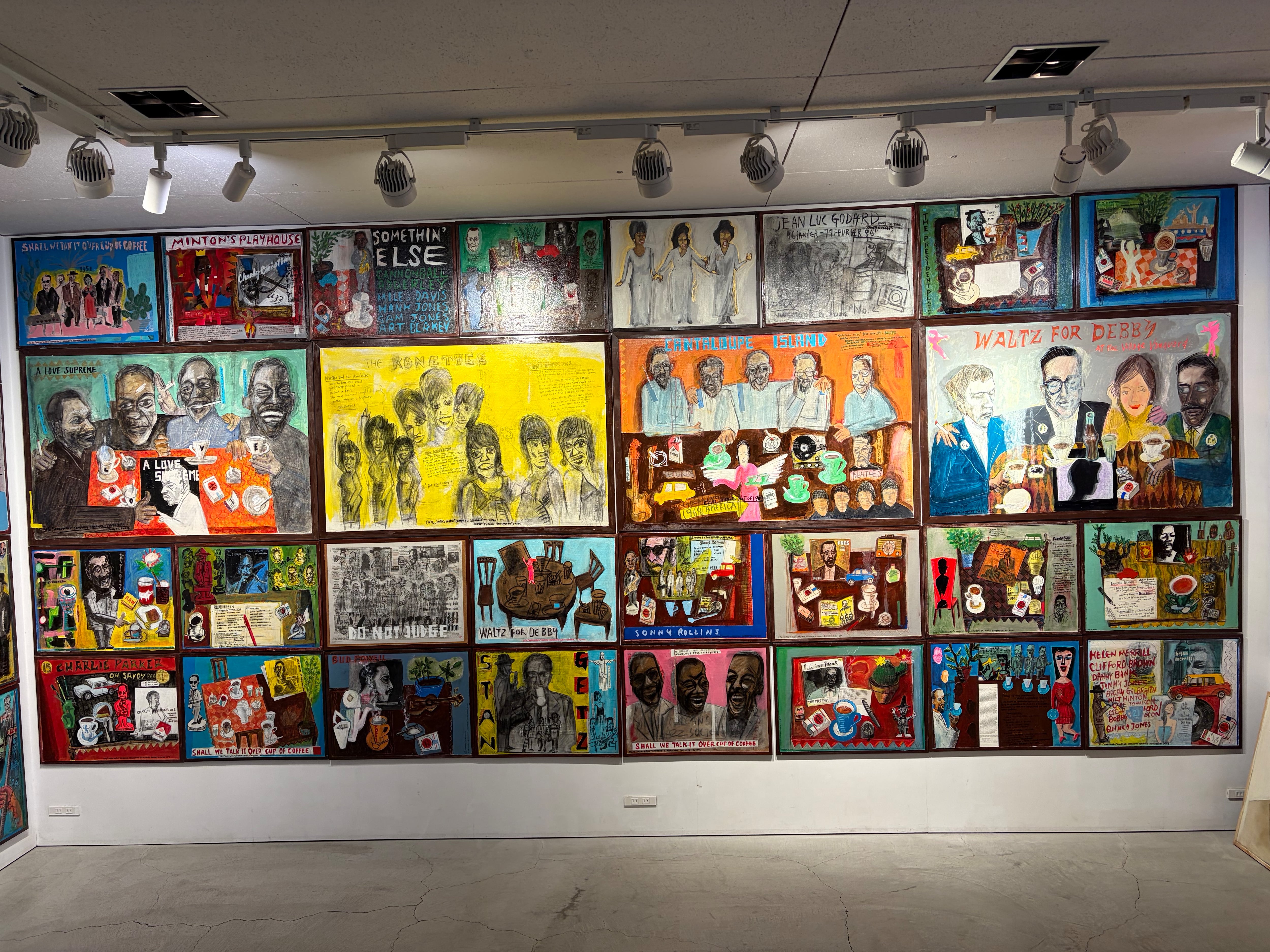 Sakanashi Tetsuro has run a small jazz bar in Osaka's Tenmabashi for 47 years. Using paper plates as his palette and paint as his medium, he creates works in the bar's space, transforming it into his studio after closing hours. His paintings, rendered on corkboard panels, feature portraits of jazz musicians, scenes with jazz records, and showcase his exceptional typographic sensibility. We also ship internationally.