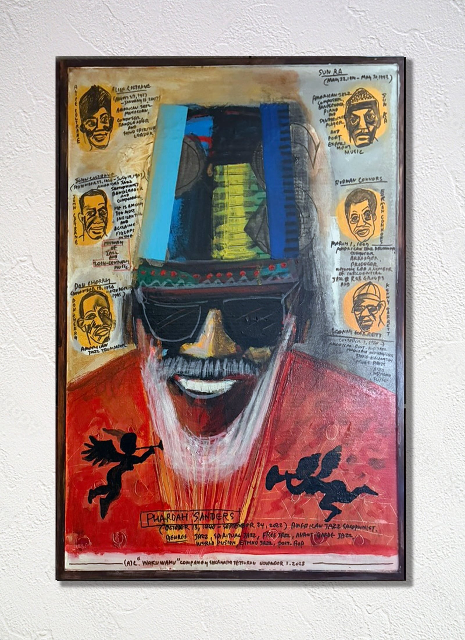 Sakanashi Tetsuro has run a small jazz bar in Osaka's Tenmabashi for 47 years. Using paper plates as his palette and paint as his medium, he creates works in the bar's space, transforming it into his studio after closing hours. His paintings, rendered on corkboard panels, feature portraits of jazz musicians, scenes with jazz records, and showcase his exceptional typographic sensibility. We also ship internationally.