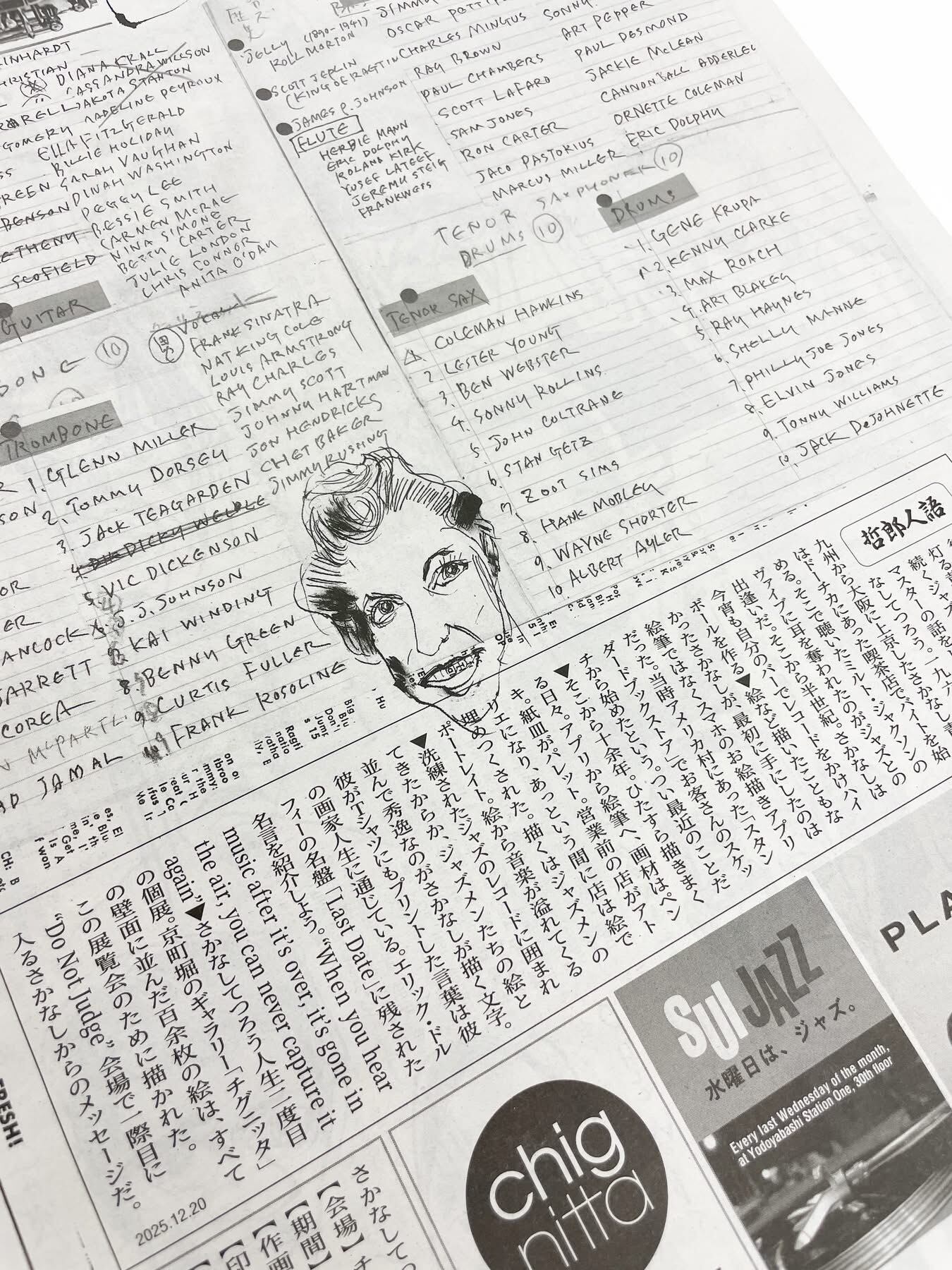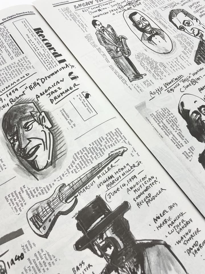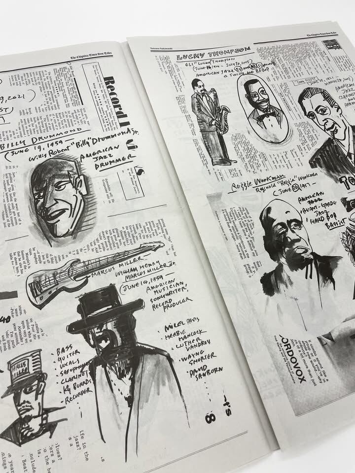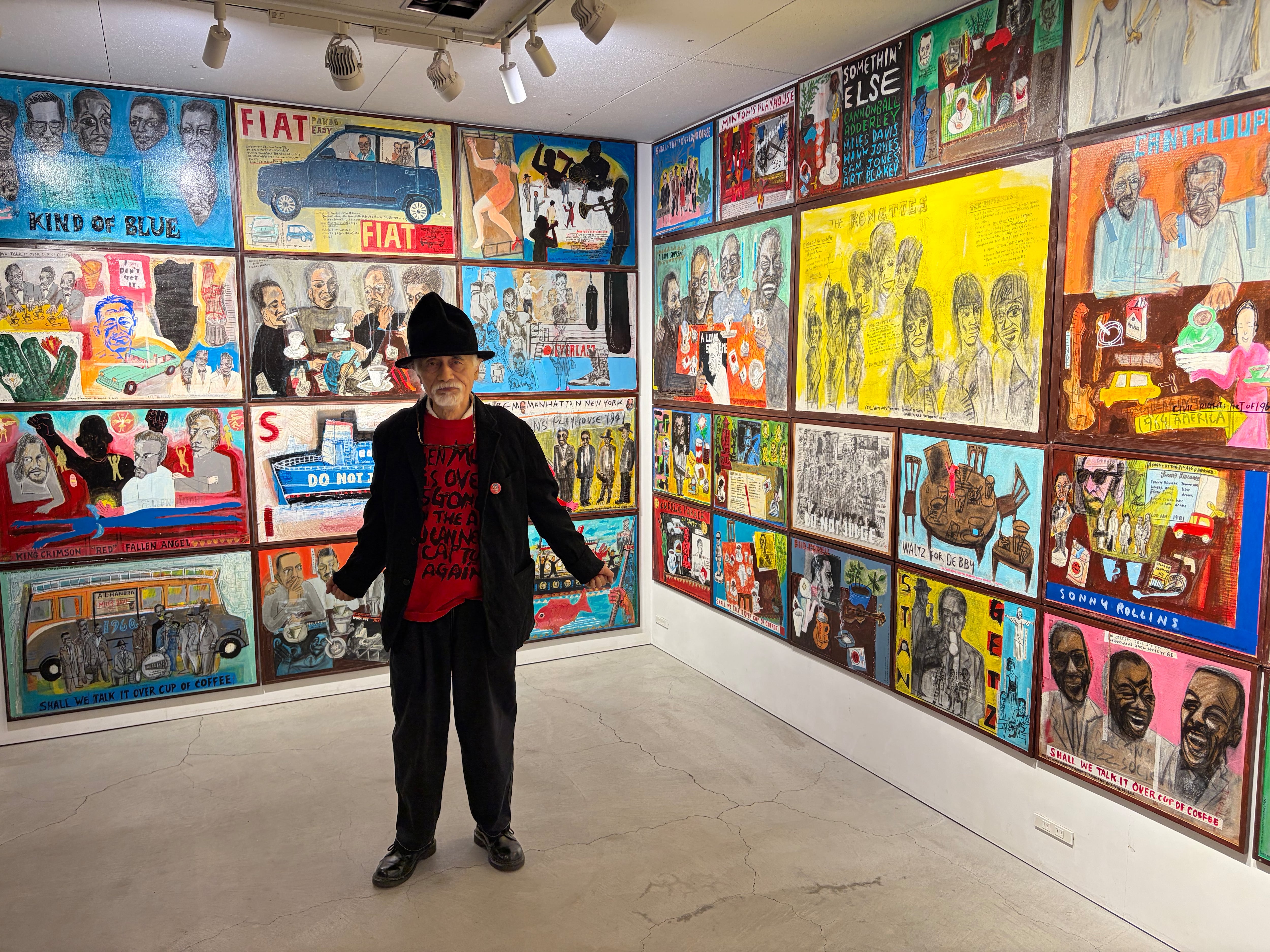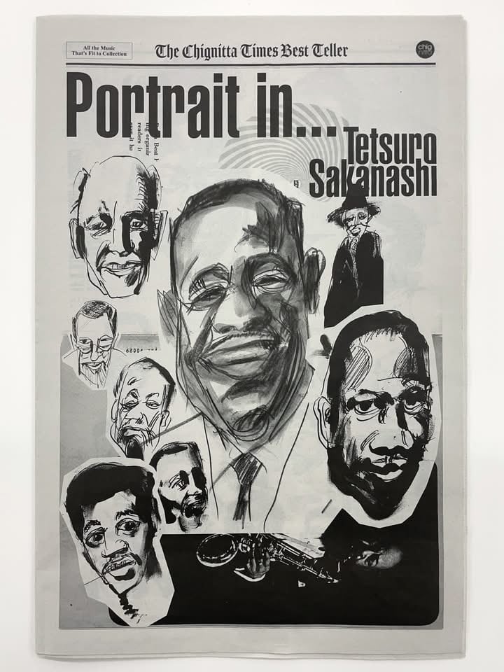 Sakanashi Tetsuro has run a small jazz bar in Osaka's Tenmabashi for 47 years. Using paper plates as his palette and paint as his medium, he creates works in the bar's space, transforming it into his studio after closing hours. His paintings, rendered on corkboard panels, feature portraits of jazz musicians, scenes with jazz records, and showcase his exceptional typographic sensibility. We also ship internationally.