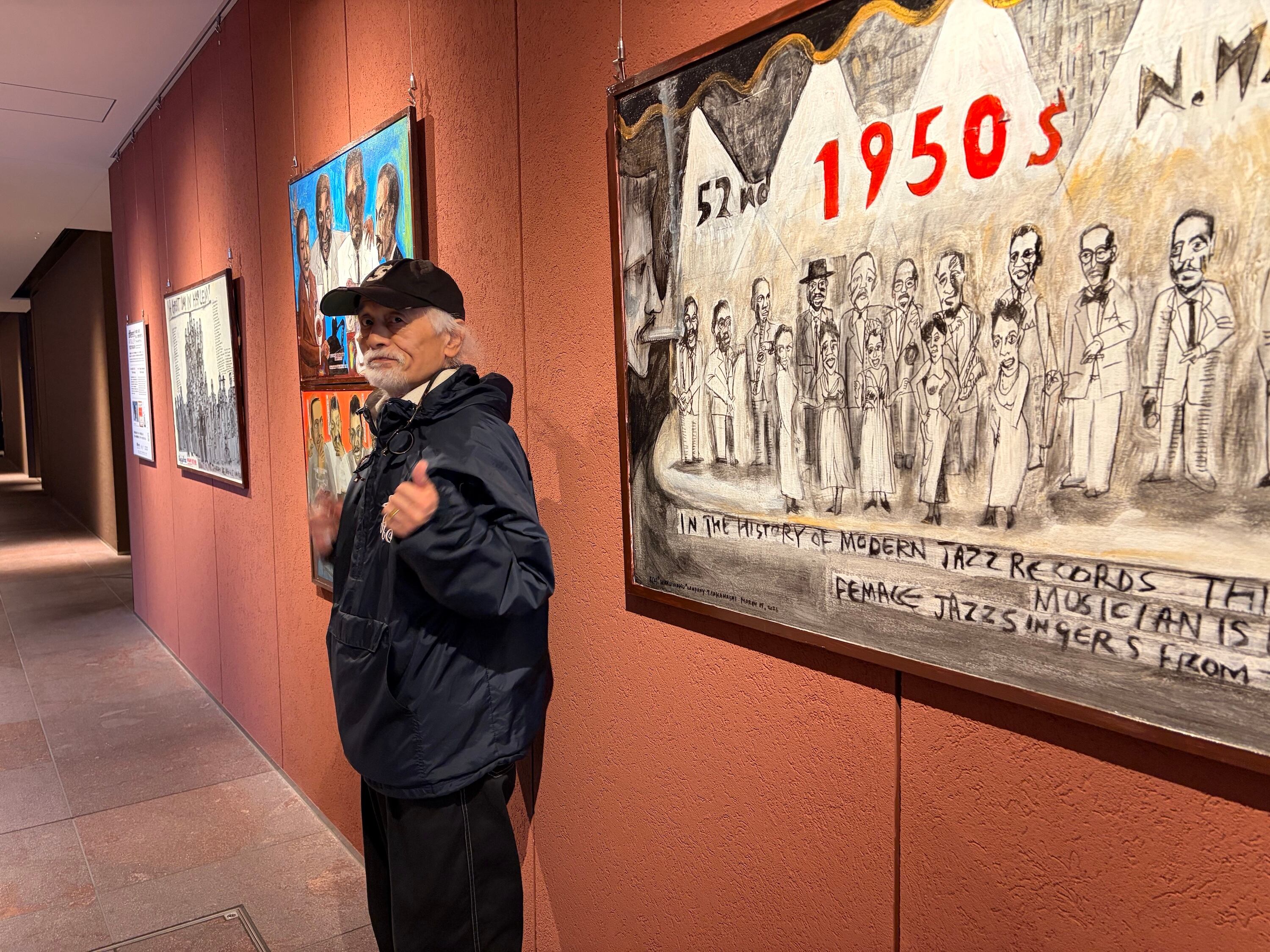 Tetsuro Sakana has run a small jazz bar in Tenmabashi, Osaka, for 47 years. Using paper plates as palettes, paint as his medium, and the bar’s interior as his studio outside of business hours, Sakashina creates his works. His paintings—featuring portraits of jazz musicians, scenes with jazz records, and outstanding typography—are rendered on corkboard panels. A tabloid-sized art book is included as a gift with every purchase. We also offer international shipping.