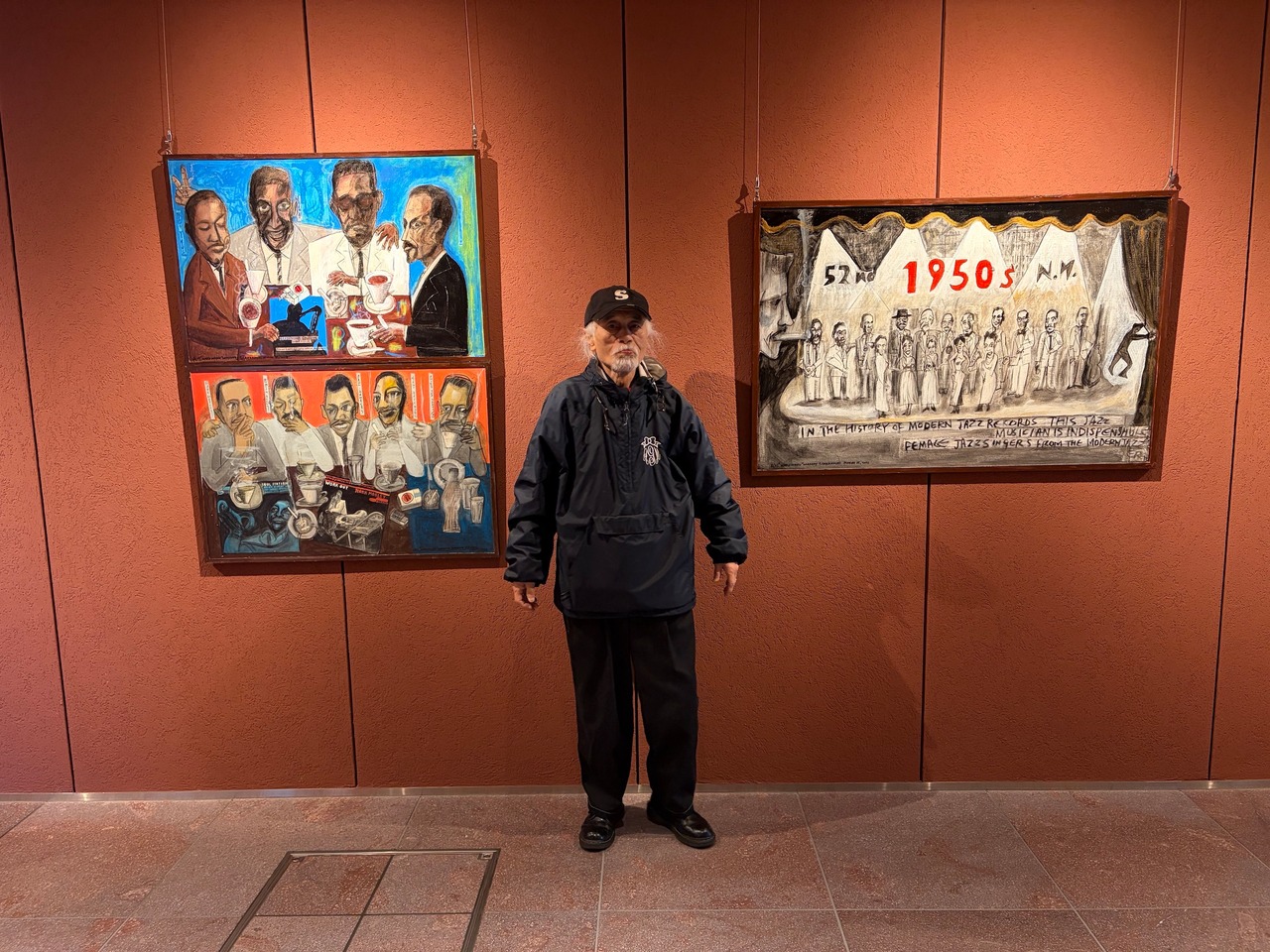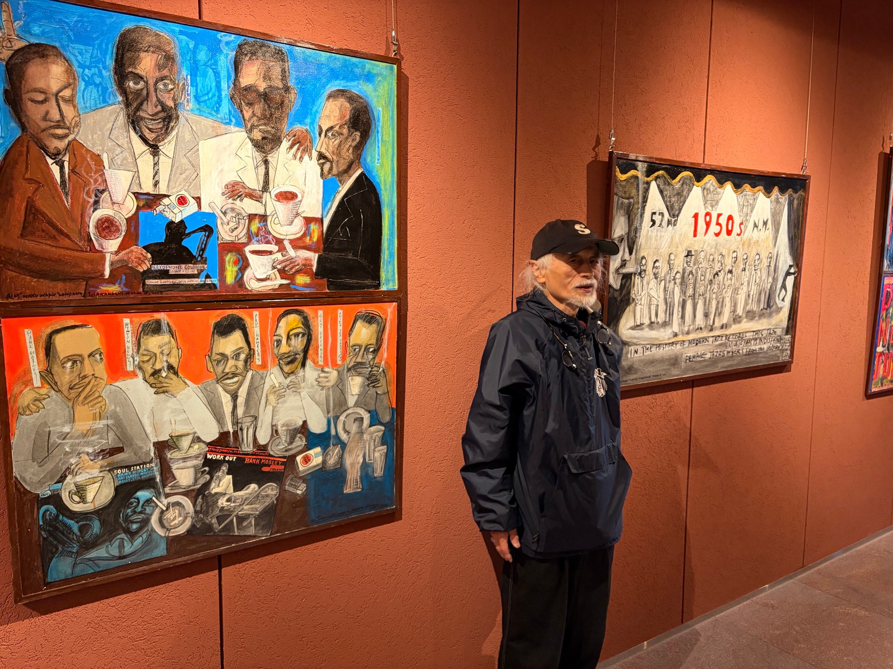 Tetsuro Sakana has run a small jazz bar in Tenmabashi, Osaka, for 47 years. Using paper plates as palettes, paint as his medium, and the bar’s interior as his studio outside of business hours, Sakashina creates his works. His paintings—featuring portraits of jazz musicians, scenes with jazz records, and outstanding typography—are rendered on corkboard panels. A tabloid-sized art book is included as a gift with every purchase. We also offer international shipping.