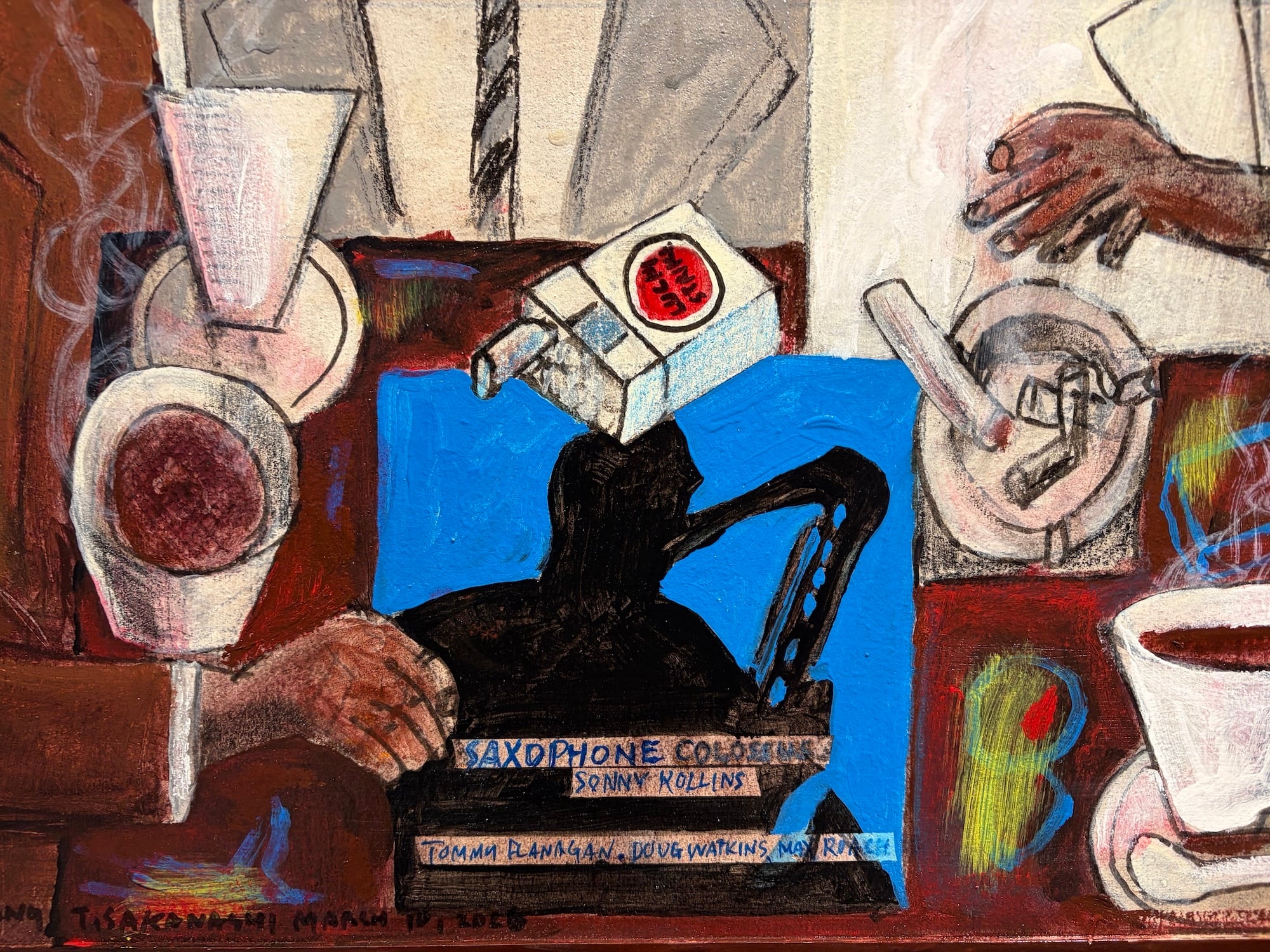 大阪・天満橋で47年間に渡り小さなジャズバーを営む、さかなしてつろう。 紙皿をパレットに、ペンキを画材に、営業時間外の店内をアトリエに作品を制作するさかなし。コルクボードのパネルに描かれるのはジャズメンのポートレイト、ジャズのレコードがある風景、タイポグラフィのセンスも秀逸なペインティング作品です。作品お買い上げの方にタブロイドサイズの作品集もプレゼントします。海外発送も承ります。